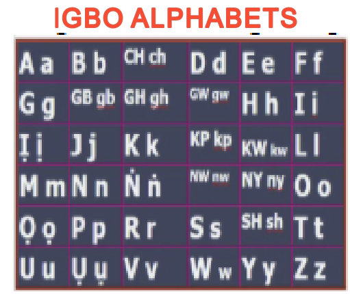 | There are thirty six letter sounds in Igbo alphabets, ten (10) more than the English alphabets. Some letter sounds have more than one letter and some others are distinguished by additional characterization, usually a dot or an accent to emphasize the differences in sounds between two identical letters. There are sounds in Igbo language which cannot be replicated in English because of the absence of similar sounds in the English Language. An example is "gb" in "Igbo". "gb" sounds like "gbom"the beginning sound produced when an empty closed vessel is hit. Another example is Ṅ as in AṄỤ (Bee), a throat sound that is very close to "ing" as used in "fishing" Another is "NY" which is not a short form of New York. But part of the word for the eye (ANYA) as in Sonia. Many other examples can be found throughout the Igbo Language. |